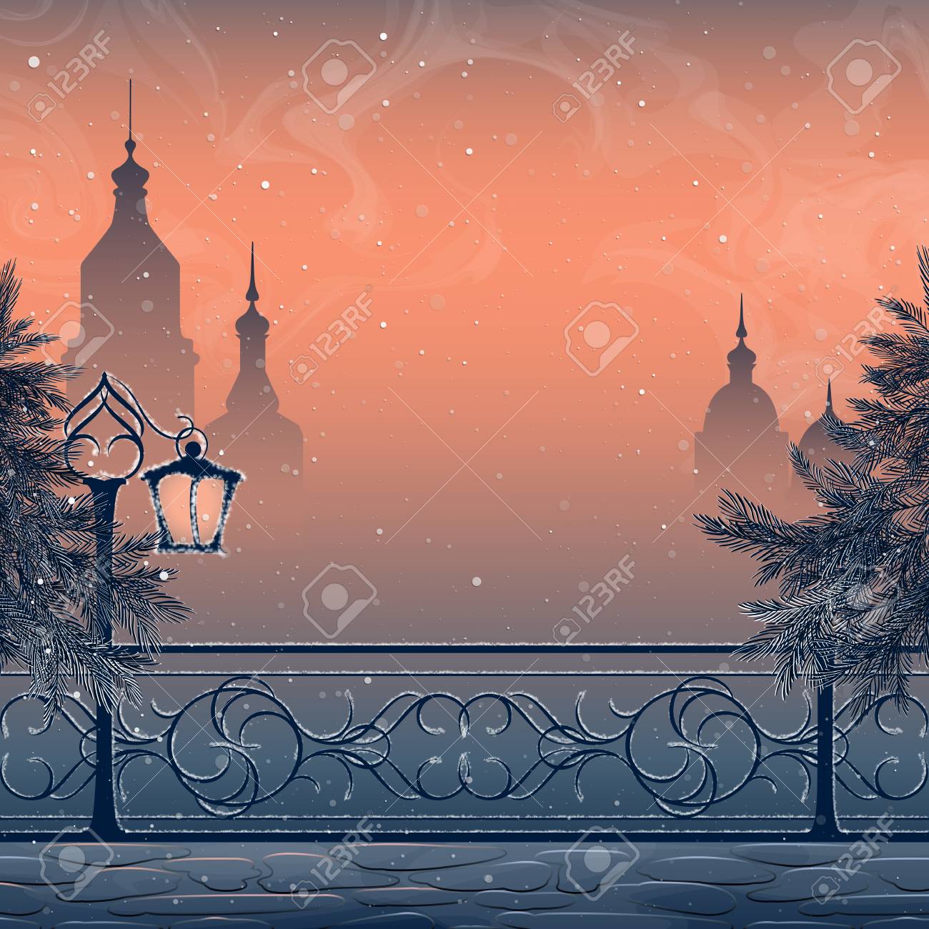 Vettoriale - Paesaggio Invernale Con La Città, La Lanterna, Il ...